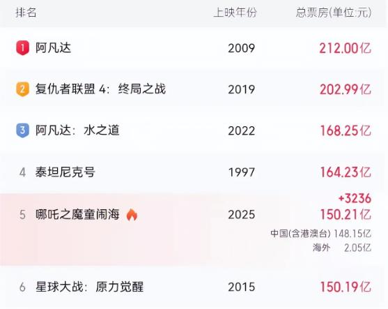 到3月15日中午,《哪吒之魔童闹海》这部电影加上预售的票房,已经超过了150.19亿,把《星球大战:原力觉醒》都比下去了,现在排在全球影史票房榜的第五名。虽然票房涨得没那么快了,想超过第四名的《泰坦尼克号》有点难,但能进前五已经超级厉害了。这说明咱们中国电影不光质量能跟好莱坞大片比,票房也能平起平坐。